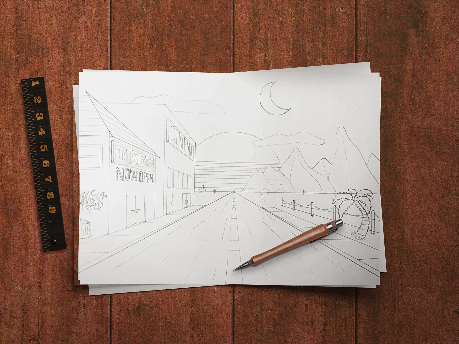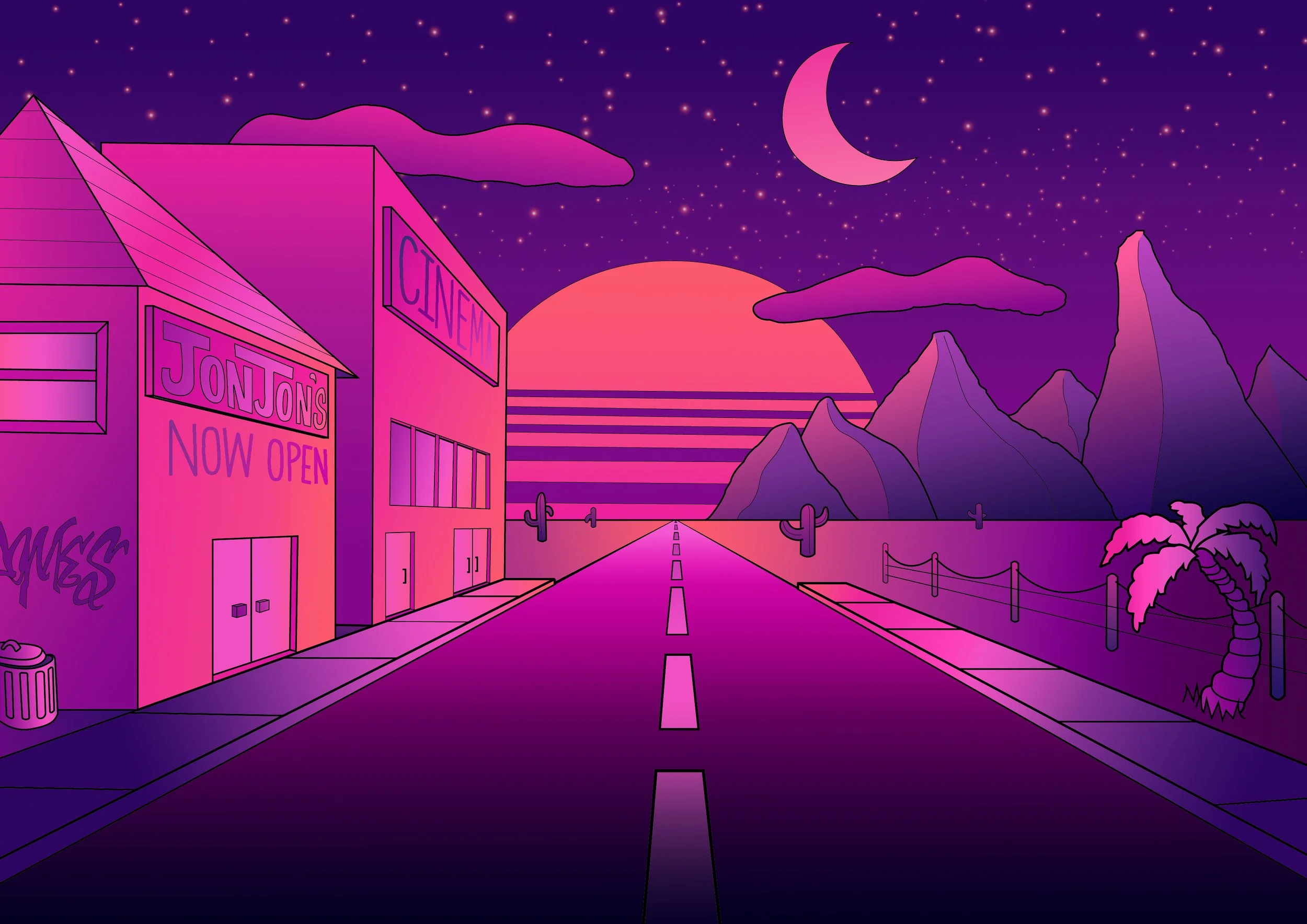 Inspired by retrowave aesthetics, the piece began as a hand-drawn perspective sketch on paper, which was manually traced into vector form and coloured with rich gradients and a cohesive neon-inspired palette.