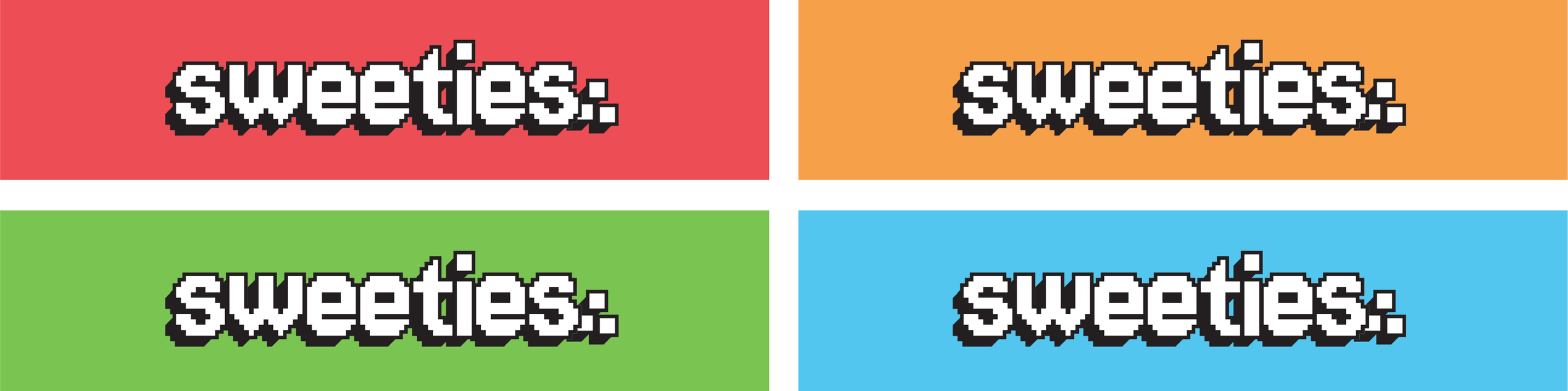The Sweeties wordmark is designed to feel like it belongs on a game cartridge or arcade cabinet. Bold, chunky and instantly recognisable, it lives exclusively on the four brand colours, never on white or black, keeping the identity energetic and consistent across every application.